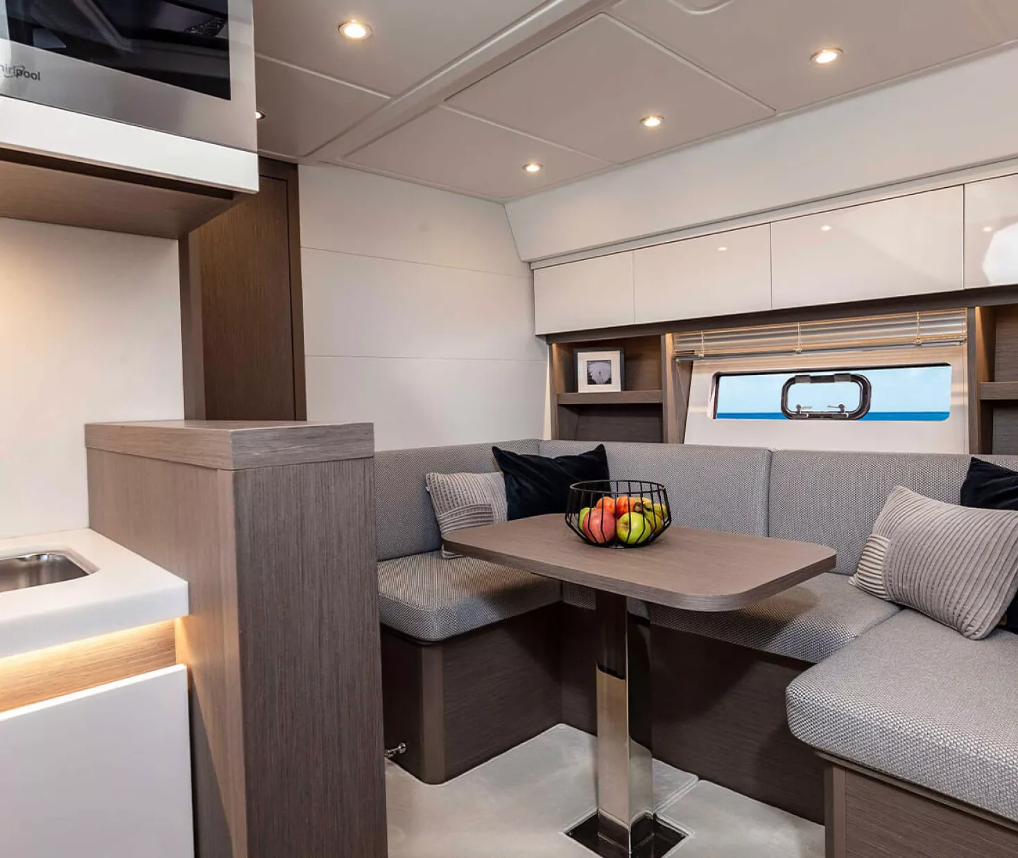 The cockpit of the Gran Turismo 45 is furnished with a vast U-shaped seat that creates a comfortable and convivial area for guests, who sit facing the Wet Bar that features a sink, fridge and ice-maker. This wetbar contains a retractable TV that can be raised to provide entertainment.
