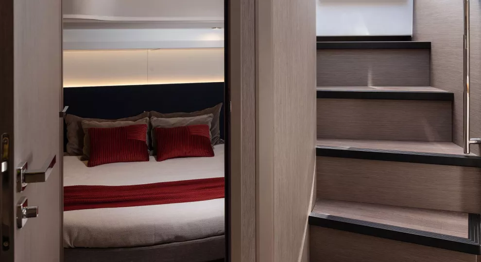 On the lower deck, all the comforts are provided to prolong the escapade at sea: a very beautiful amidships owner’s cabin with its en-suite, a guest cabin at the bow with a second bathroom, a sociable saloon and a large equipped kitchen. The elegant and warm atmosphere offered by the grey walnut wood characterises the new generation of Express-Cruisers.