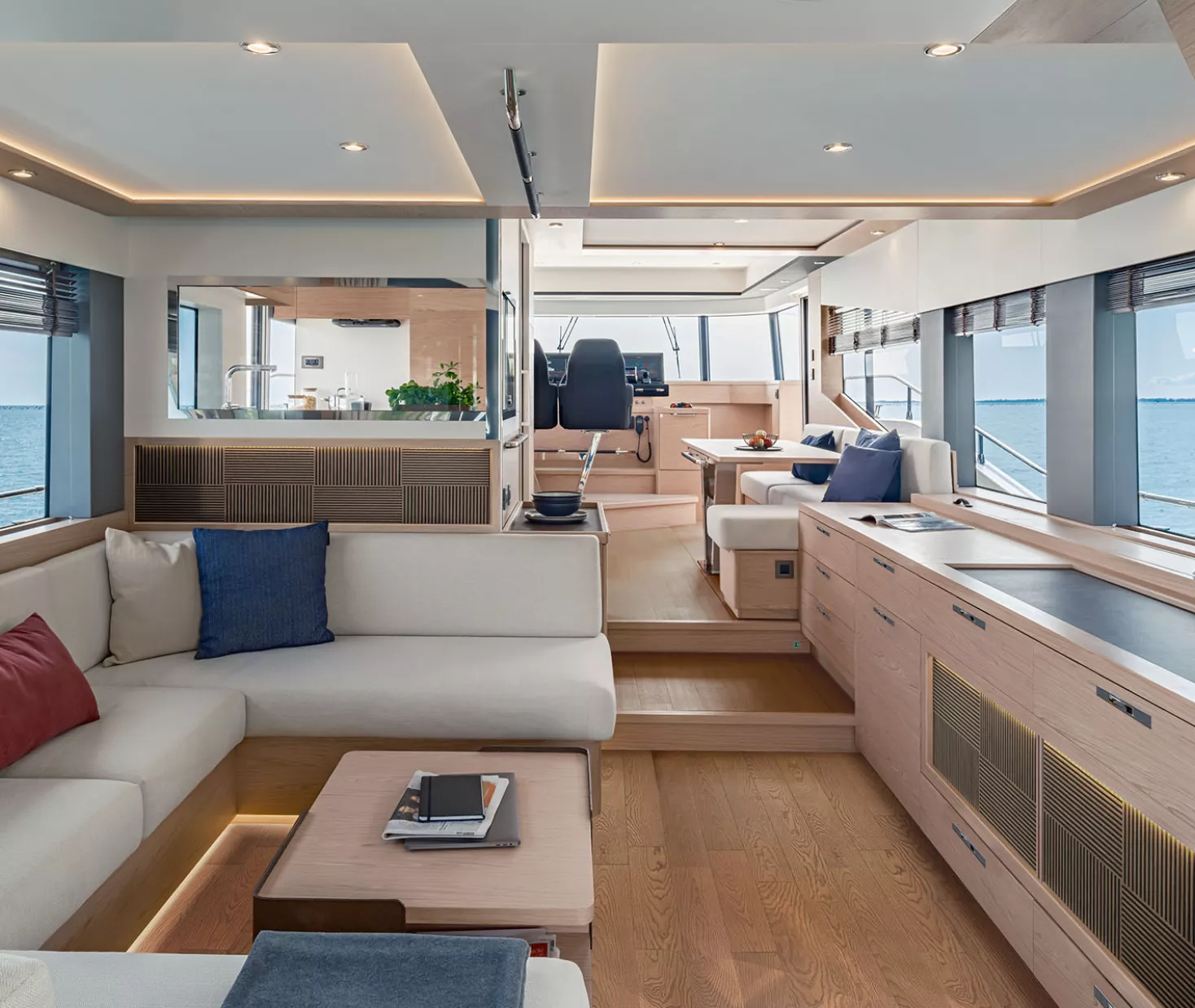 Step aboard and discover interiors designed to enhance life at sea. Available in three or four cabin layouts, each stateroom offers plush comfort with voluminous bathrooms, upgraded fixtures, and elegant finishes. A centrally located galley means you are always just a few steps away from the yacht’s key areas – the helm, the flybridge, the salon and adjacent “terrace on the sea”.