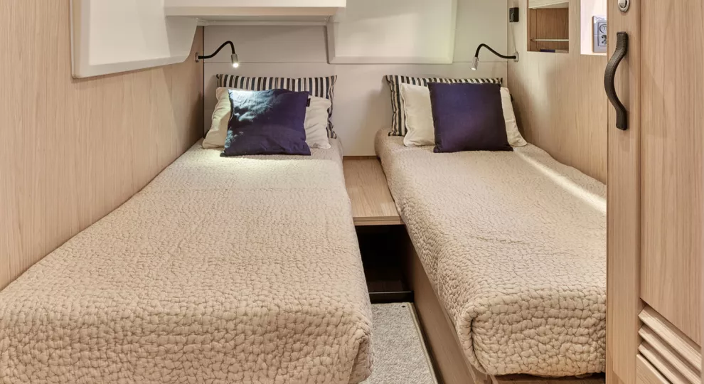 The port guest cabin has two single berths with an infill to make up a double berth. This cabin also features an en-suite door to the portside day head.