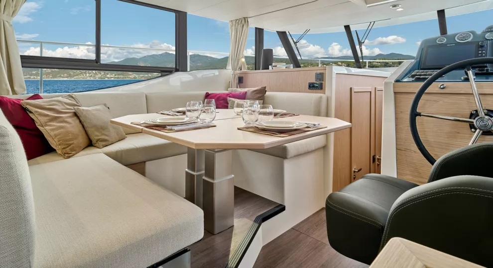 Forward of the galley a spacious raised U-shaped dinette provides seating for up to 8 with great views all around.
